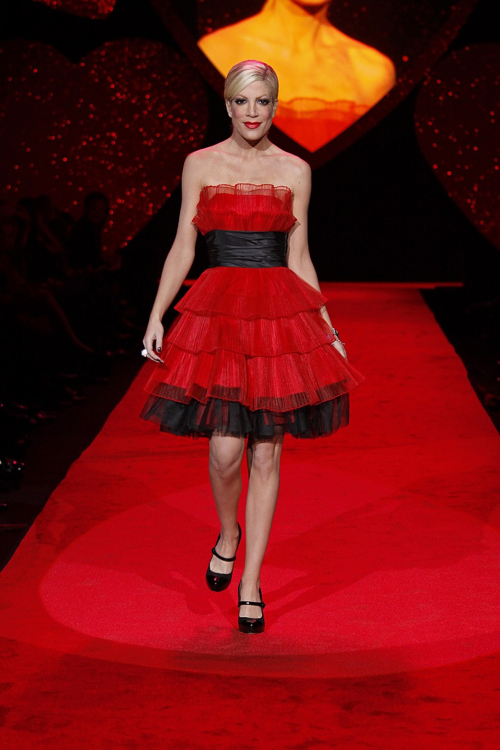 Předávání cen iHeartRadio Music Awards přilákalo mnoho známých osobností. Spelling na tuto akci dorazila ve výrazných červených šatech s vysokým rozparkem. Horní část modelu tvořil částečně průsvitný korzet se zdobením. Látka velmi pevně obepínala její hrudník a vytvářela hluboký dekolt. Objemné poprsí do těsného vršku vtěsnala jen s velkými obtížemi.