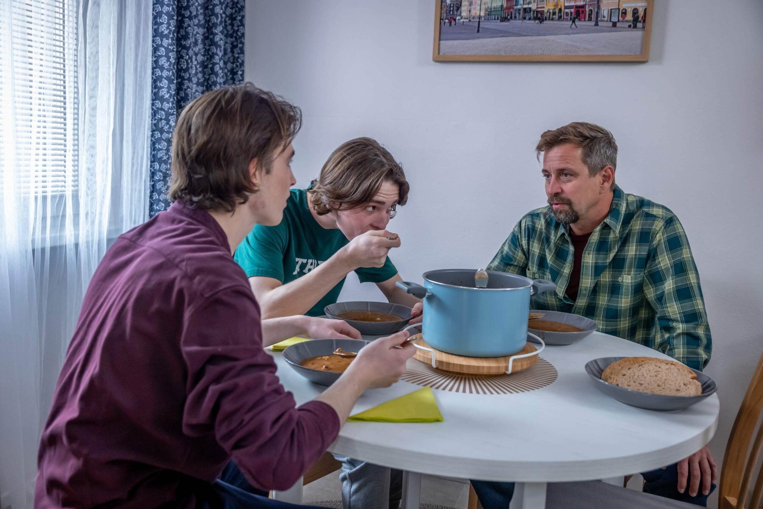 „Petr mě pozval k sobě domů na večeři,“ svěří se Magda (Veronika Čermák Macková) Otíkovi (Filip Rajmont). „Další pokus o sblížení s klukama?“ zajímá se její kolega a kamarád, který samozřejmě o problémech, které nastaly poté, co Petr (Jan Dolanský) synům přiznal vztah s Magdou. Navíc Magda by se nejraději setkání s Markem (Jan Dlouhý) a Matějem (Jiří Dlouhý) vyhýbala. Jenže Petr má nyní důvod k oslavám… Jak to nakonec dopadne?