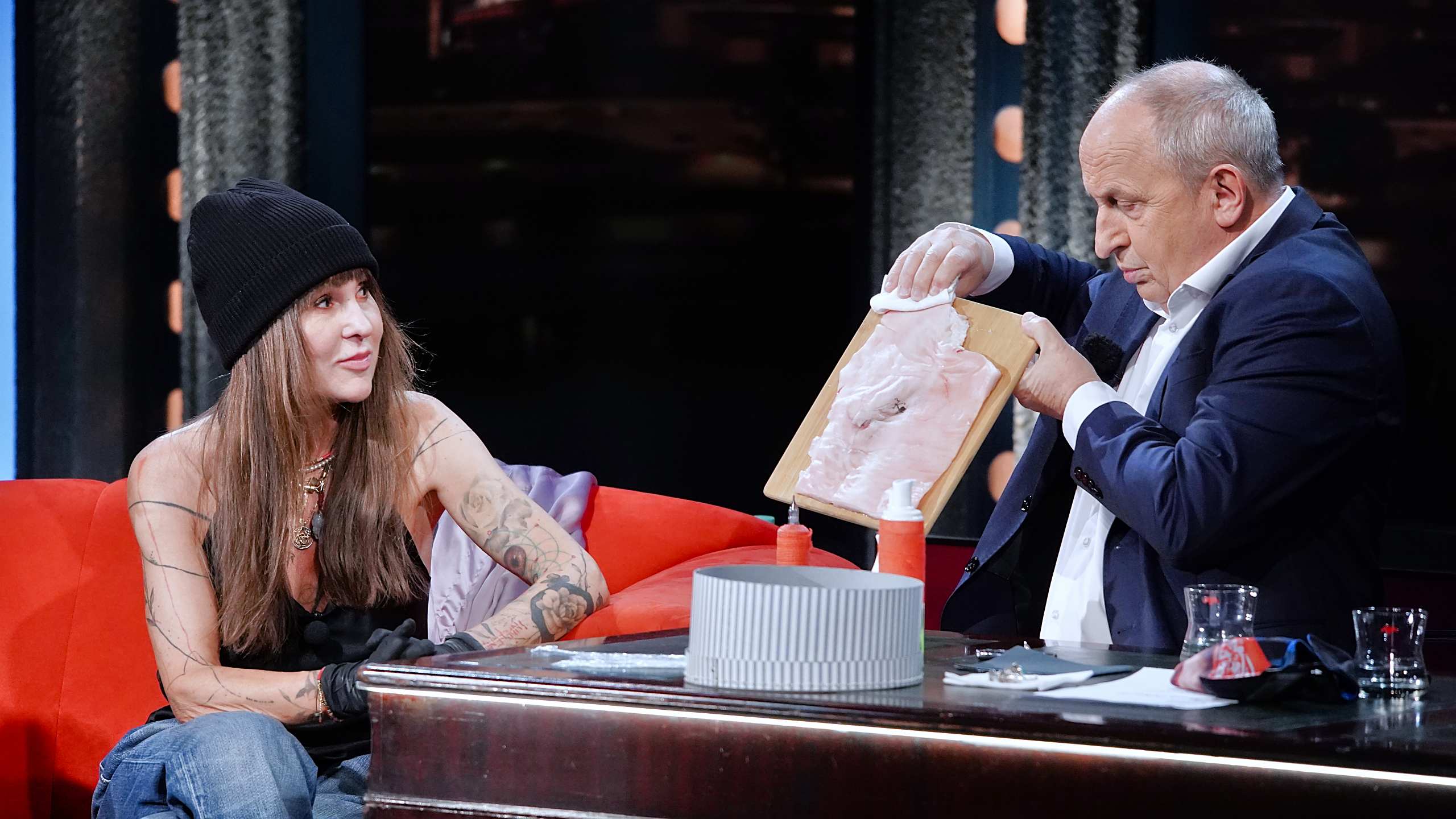 Kateřina Hrachovcová má s sebou i veškeré potřebné tatérské vybavení, a tak nabídne směrem do publika možnost nechat se na místě potetovat. „Nemůžeme ho do ničeho nutit, to v žádném případě, ale je to zážitek, budete mít podporu celého sálu,“ snaží se zcela marně přesvědčit pana Odvárku – věrného diváka Show Jana Krause. Nakonec předvede své tatérské umění na kusu vepřové kůže.