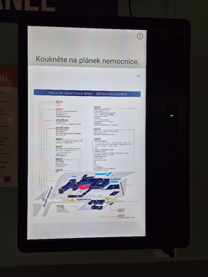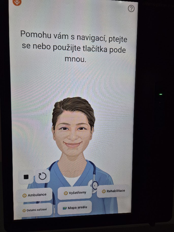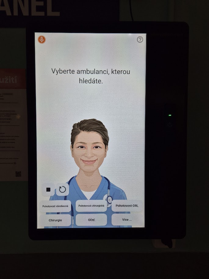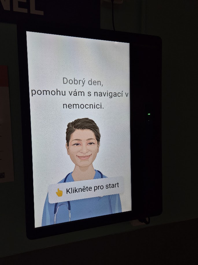 Intuitivně a na pár kliknutí můžete zjistit kudy se vydat na požadované místo. Hledáte ambulanci? Nebo vyšetřovnu? Chcete se podívat na celou mapu areálu? Není problém. Tato animovaná sestra vás nasměruje. Nutno ale dodat, že stejnou službu udělá i paní i okýnka na centrální evidenci, ke které stejně musíte s malým pacientem nejprve jít, aby jej zadala do systému. Takže slyšet při odchodu „na oční ambulanci půjdete tady vpravo a o patro níže po schodech,“ je rozhodně rychlejší než něco ťukat do obrazovky.