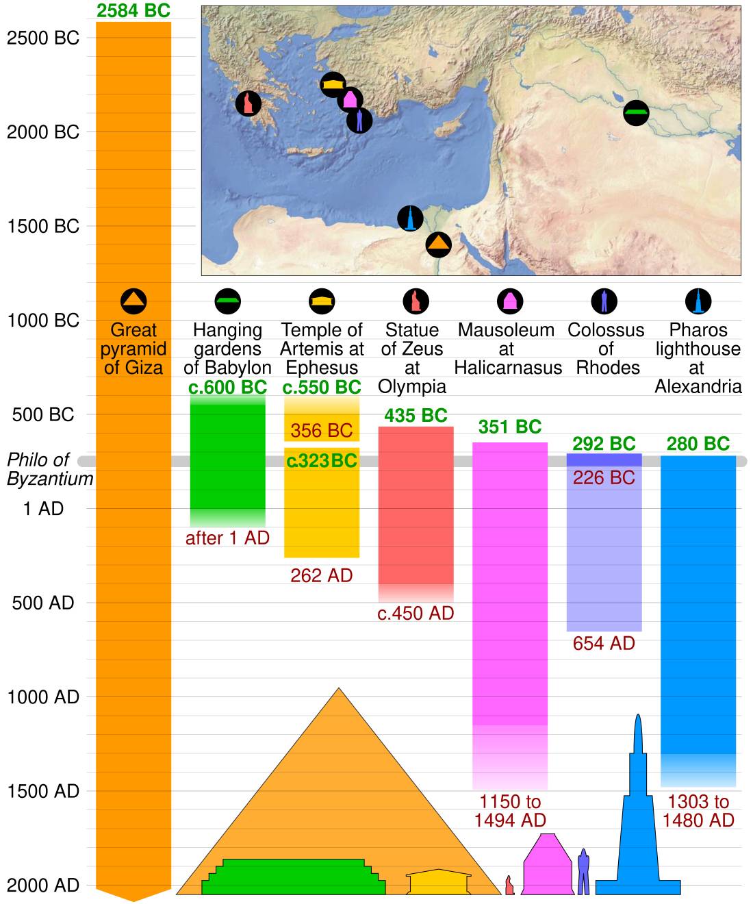 Sedm staveb mělo ukazovat vrchol lidské dovednosti a odvahy. Do seznamu se dostaly pyramidy v Gíze, visuté zahrady Semiramidiny, Artemidin chrám v Efesu, Feidiova socha Dia v Olympii, mauzoleum v Halikarnassu, Rhódský kolos a maják na ostrově Faru.